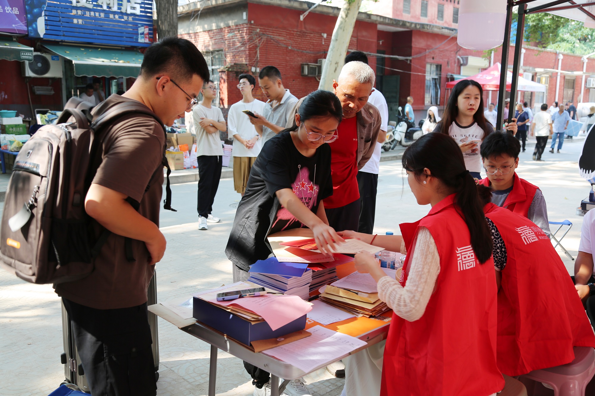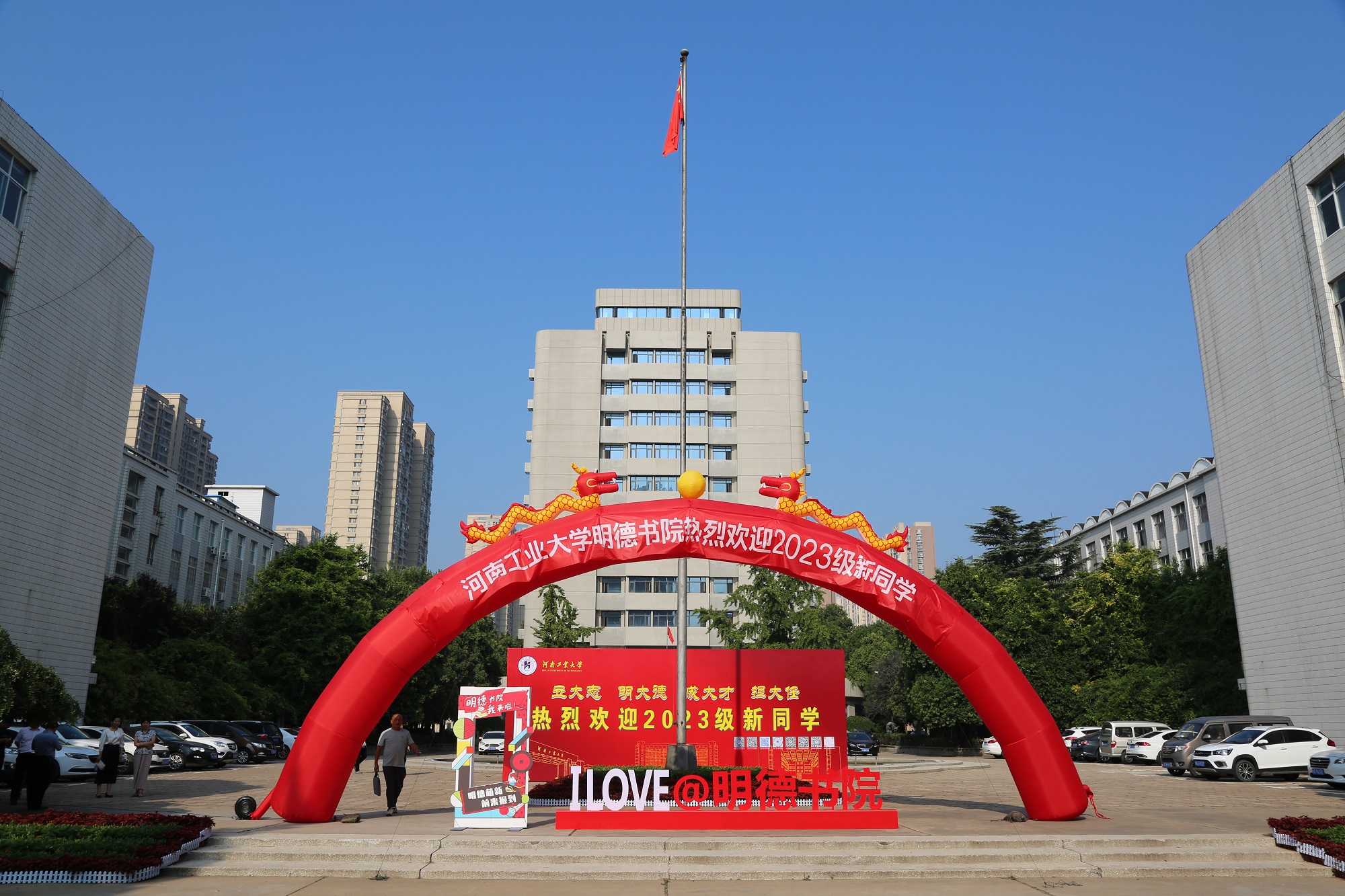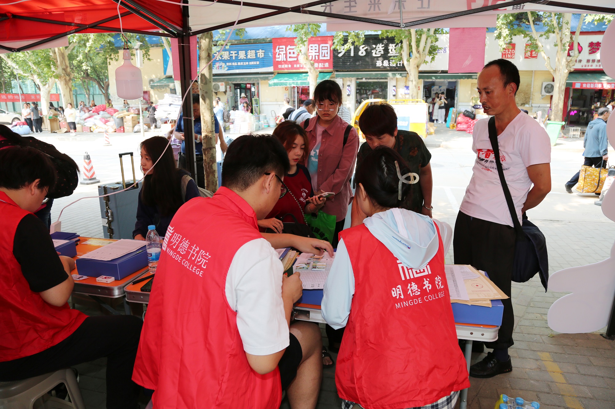、学生活动以及各专业特色的展板;迎新帐篷下,新生助教们认真核对新生信息,发放入学手册以及校园卡;在“绿色通道”专区,学生资助管理中心的工作人员为办理贷款的新生答疑解惑并办理相关手续。书院还设置了“家长休息区”,为家长提供免费饮用水,让一路奔波劳顿的家长们可以静心休息。明德“红马甲”成为校园内一道靓丽的风景线,他们帮忙搬运行李、答疑解惑,让属于明德学长学姐的温情洒满校园的每个角落;预备役队员们精神抖擞的进行车辆引导,有效确保了迎新秩序的井然。