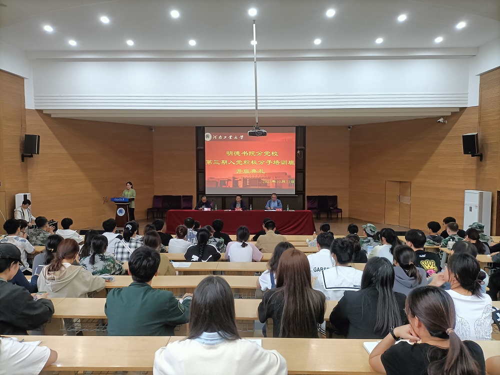 分党校第三期入党积极分子培训班在嵩山路校区小礼堂顺利开班。书院党委副书记刘飞翔,团委副书记薛晓晓,学生党员代表、学生代表和78名入党积极分子参加,典礼由薛晓晓主持。