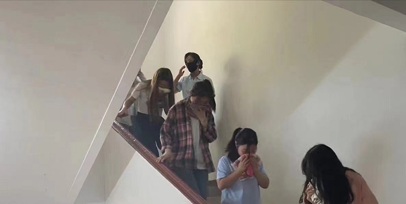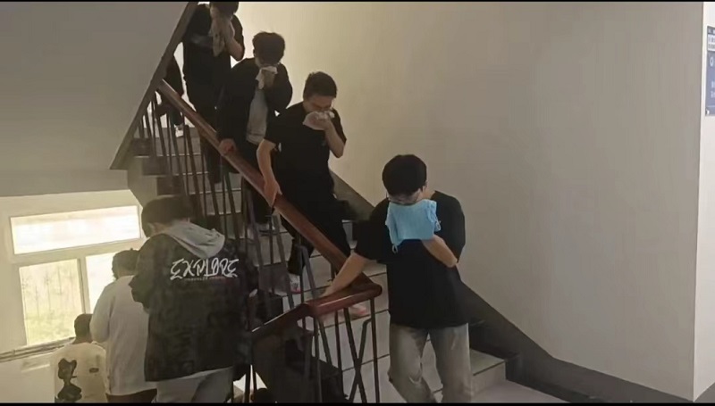 随后在东校区学3和学5宿舍楼进行火情模拟。宿管人员发现火情及时上报东校区保卫科并报警,东校区各部门立即启动应急预案,组织人员疏散逃离。师生们按照火场逃生疏散演练技巧,分别采用湿毛巾和衣角捂住口鼻弯腰低姿前行,沿着楼道和楼梯快速通过各个安全出口,有序离开宿舍楼,疏散到学校安全地带。最后,消防中队王队长对疏散演练进行了点评,对演练过程中广大师生表现出的沉着冷静、反应敏捷予高度评价,希望学校和师生们以此为契机,增强消防安全意识,落实消防安全责任,排查杜绝消防安全隐患,为大家的生命财产安全保驾护航。