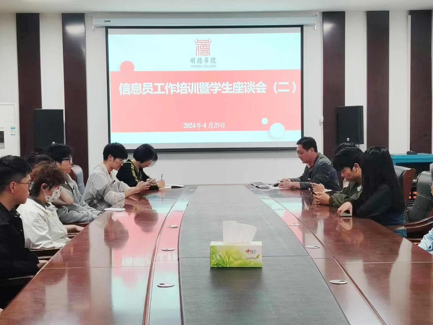 在嵩山路校区207会议室召开本学期第二场学生信息员工作培训暨学生座谈会。导师服务中心主任王丽波、23级外语类、新闻类、法学类专业学生信息员参加会议,会议由教学办主任李自新主持。