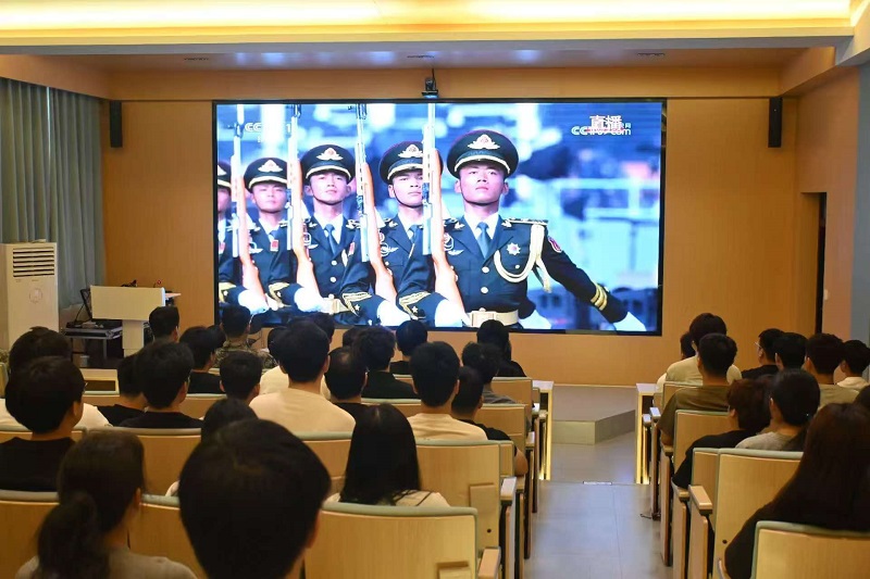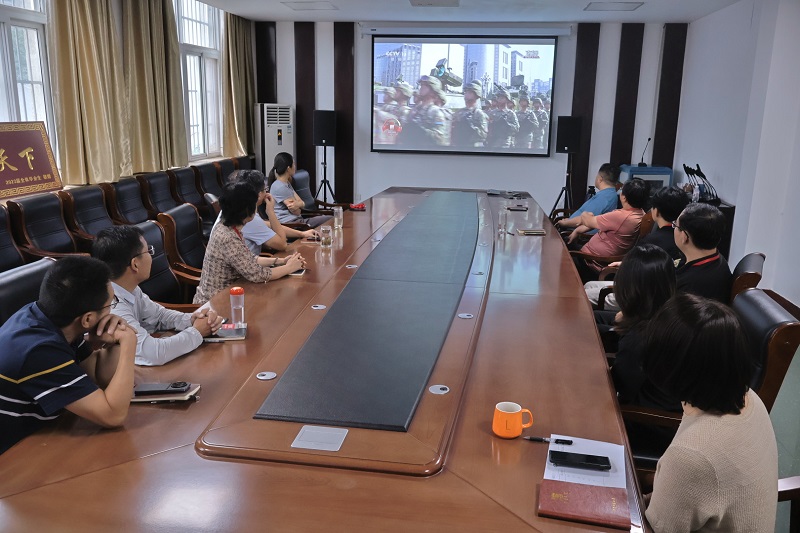 207会议室气氛庄重而热烈,全体教职工齐聚一堂,共同观看阅兵直播。实验楼118会议室座无虚席,李嘉晨琦所在专业全体学生早早守候。大屏幕上,整齐的方阵、先进的战机、威武的战车依次通过天安门广场,展现国家的强大实力和国防建设的辉煌成就。教职工们神情专注,眼中满是自豪与激动。观看过程中,大家不时交流讨论,回忆起抗日战争时期无数先烈为了国家和民族的独立,抛头颅、洒热血的英勇事迹。