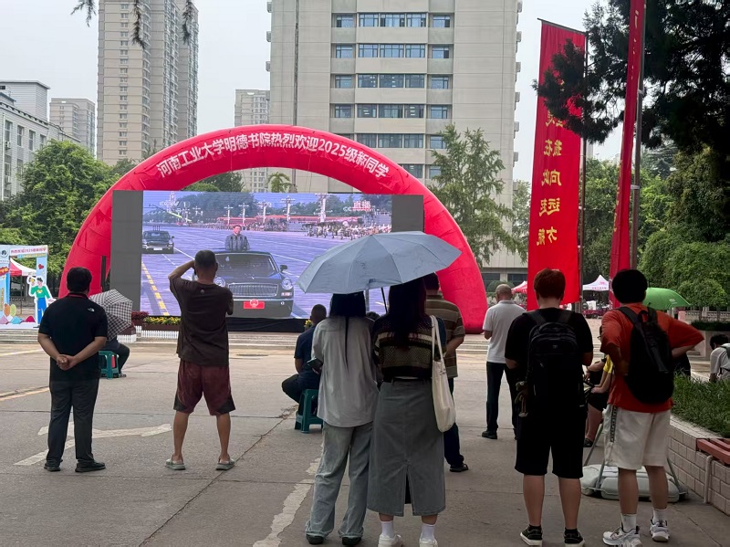 电子大屏前聚众心。喷泉广场上,巨大的电子大屏矗立在中央,成为纪念中国人民抗日战争暨世界反法西斯战争胜利80周年活动的重要展示窗口。阅兵开始后,大屏实时转播天安门广场阅兵盛况,逐渐聚集了前来报到的新生及其家长,大家纷纷驻足观看,神情专注、情绪激动。不少家长表示,能在校园里第一时间看到阅兵直播,感到非常震撼和自豪。一位家长感慨道:“看到国家有如此强大的军事力量,我们对未来充满信心,也更加珍惜今天来之不易的和平生活。”