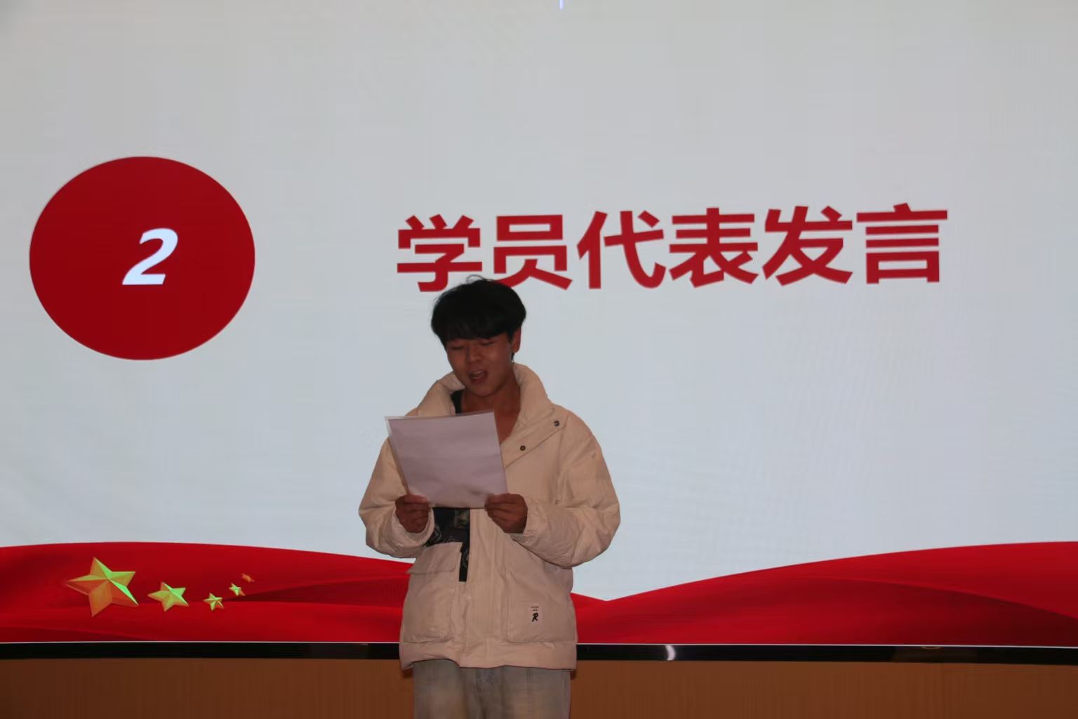 张淼同学作为学员代表发言。他表示,分团校是深入学习党的精神、锤炼理想信念的重要平台,同时也是连接人文情怀与青年使命担当的桥梁。他承诺将履行好“服务者”与“同行者”的职责,带领同学们勤学、笃行,充分展现青年的责任与担当。