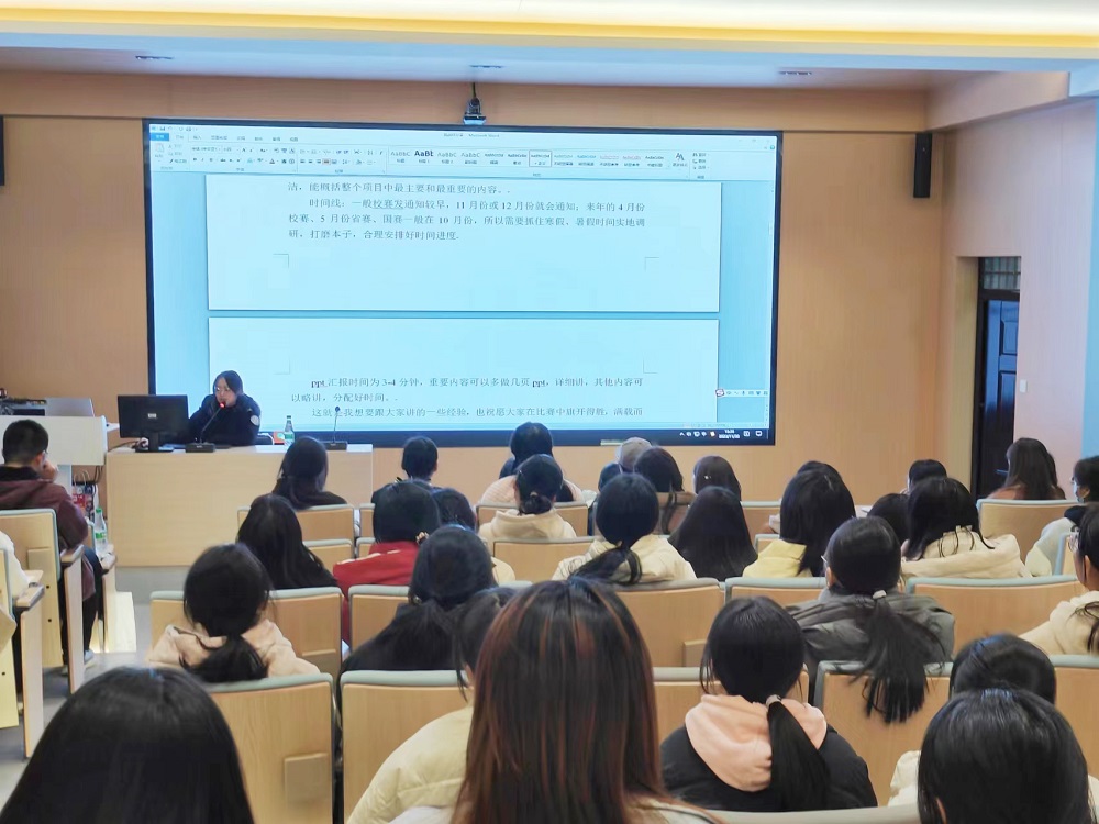 首先付艳勤向在场的同学们介绍了考研的相关知识,分享了自己的考研学习计划和学习方法,为同学们今后的学习生活提供了切实有用的建议,坚定了同学们的决心。常怡春从保研政策方面切入,为同学们介绍了保研所要做的相关准备以及注意事项。曹婷婷主要分享了有关学科竞赛的相关知识,她以丰富的竞赛经验,详细阐释了“挑战杯”的竞赛规则,先后介绍了“挑战杯”中国大学生创业计划竞赛与“挑战杯”全国大学生课外学术科技作品竞赛,同时展示了自己此前参赛项目作品,让同学们切实了解到竞赛的相关内容。