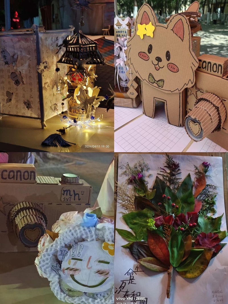 本次活动内容丰富,包括两个核心方面:“变废为宝”创意作品制作与低碳校园生活海报绘制。“变废为宝”鼓励同学们化腐朽为神奇,将身边的废旧物品如纸箱、废纸等用自己的创意加以改造,制作出兼具艺术美感与使用功能的作品,体现循环利用之智慧。海报绘制则呼吁同学们通过绘画的方式宣传低碳绿色校园生活,以鲜活灵动的画面传递环保呼声,深情诠释绿色生活理想。