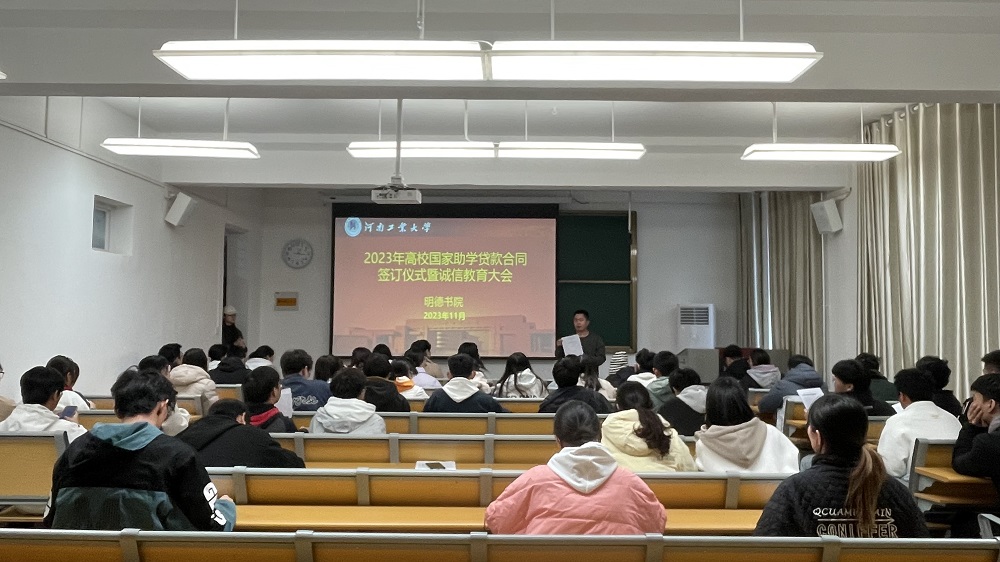 在实验楼206教室举行2023年高校国家助学贷款合同签订仪式暨诚信教育大会,全体申请高校贷款学生及资助助理共计80余人参加,会议由谷保材老师主持。